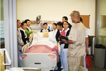 看護学部訪問では、リニューアルされたシミュレーション演習室で、静脈注射、創洗浄など基礎看護技術に関する演習を体験します。工学部では「MCI(Mass-casualty incident )」の講義を受け、災害やテロなどの場面を設定した救助訓練を現地学生とともに演習します。1日8時間以上勉強するという現地学生たち。演習のあとは、ランチをともに楽しみ、学生同士の交流を深めます。