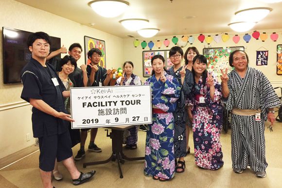 現地スタッフとともに浴衣で参加し、折り紙やお手玉、盆踊りなど、利用者の方々に楽しんでもらえるよう頑張りました。